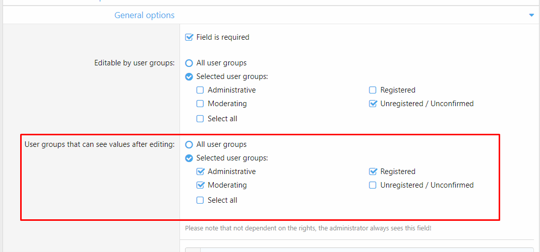 - Выбора групп пользователей, которым разрешается видеть значение доп. поля в темах. Обратите внимание, что администратор и автор темы всегда видит значение этих полей не зависимо от данной настройки.