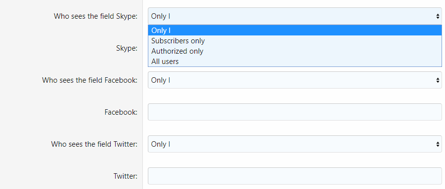 - Скрытие значения доп. полей пользователей самими пользователями. Обратите внимание, что администратор и владелец профиля всегда видит значение полей не зависимо от указанных настроек. Критерии видимости: