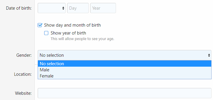 - Выбора пола пользователя.